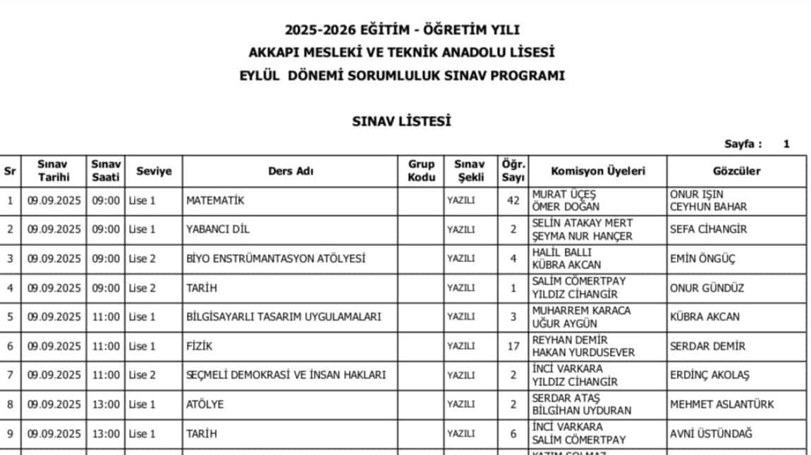 Eylül Dönemi Sorumluluk sınavları aşağıdaki programa göre yapılacaktır. örgün ve MESEM öğrencilerimize duyurulur.